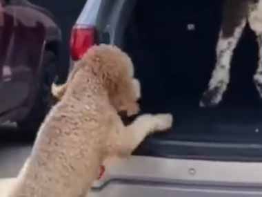 2匹のイヌと車でお出かけ。でも後ろの荷台から上手く登れない → 1匹、甘えん坊です…