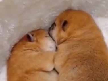 2匹のイヌの赤ちゃんがくっついて寝ていた。うんしょ、うんしょ! → 3匹目はこうなります…