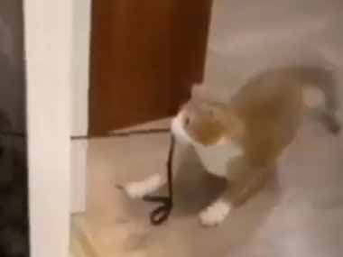2匹のネコが紐を咥えていた。負けないぞぉ! → ドアを挟んでこうなります…