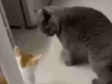 2匹のネコが見合っていた。若い猫が立ち上がって威嚇する! → 貫禄猫はこうした…
