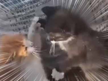 2匹の子ネコが殴り合いのケンカをしていた。ポカスカ! → 3匹目はこんな感じ…