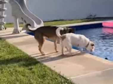 2匹の犬がプールサイドにいた。1匹が浮いているボールを取ろうとする → もう1匹はこうします…