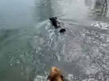 3匹のイヌと湖にやってきた。2匹はすぐに泳ぎ出す → 1匹はこうなった…