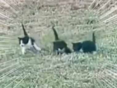 3匹の子ネコと犬が外で遊んでいた。まてまてまて~! → 3つの毛玉、追いかけっこです…